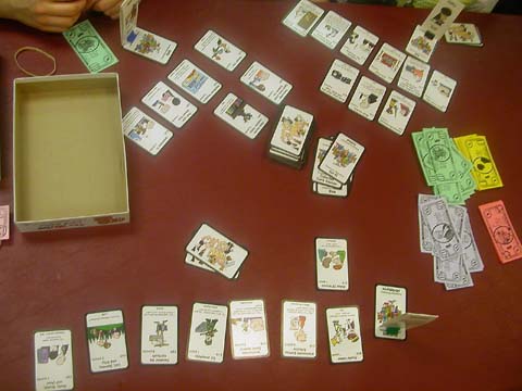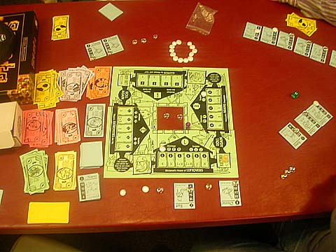 Dog's Life is a theme heavy, strategy lite game. Players play dogs doing dog-ly things: eating, fetching bones, piddling, avoiding the dog catcher. This is done on a board representing a neighborhood. (It's a closed loop, so it must be Pleasantville. :-) With that many people, there's a lot of down-time between plays, which made for more time to socialize, which is good because the game itself requires little thought.