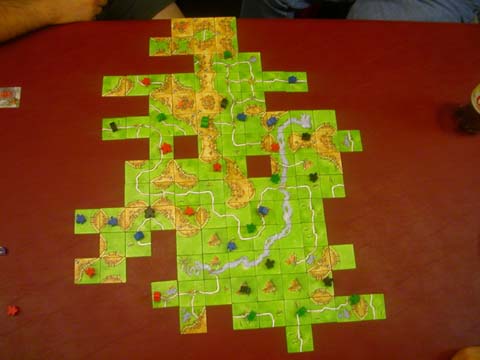Carcassonne with River Expansion. It was Matt, Cindy, Andrew, Adam and me playing Carcassonne. This was Matt's game, and Cindy and I were new players. This game is a fun tile-laying game in which you place tiles and leave behind a developer, if you so choose, to score points on either roads, palaces, citadels or farms. Farms are trickier because those developers stay on board until the end of the game, unlike the other developers which are available for reuse as soon as they score. All I know is I ended up with a lot of citadels which didn't score during the game. I had fun playing the game, though. Looking back through the rules, we played two things incorrectly. A completed palace that's only two tiles big scores two points rather than the full four we played. And partial palaces during final scoring, shields score one point and palace tiles score two, as opposed to one/one as we played. (Wouldn't have helped my score at all.) Game ended after about an hour and a half.