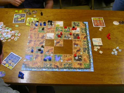 Java. It was Tony, Cindy, Rob and me, with Cindy playing for the first time. You could tell Cindy was seriously thinking about all her moves, which earned her second place. This time, we took over all the reservoirs early on, going for the quickie points. Even Tony, who held back to build palaces, eventually couldn't resist the draw of water. Rob was ahead until final scoring. Tony kicked it off, leaving Rob to be last during final scoring round, which significantly crippled him. The game lasted about 1.5 hours, excluding about 15 minutes to explain all the rules to the newbie.
